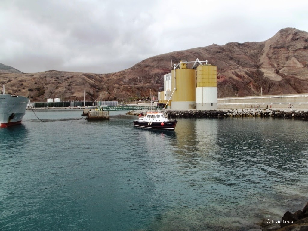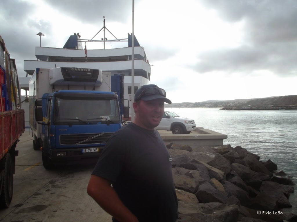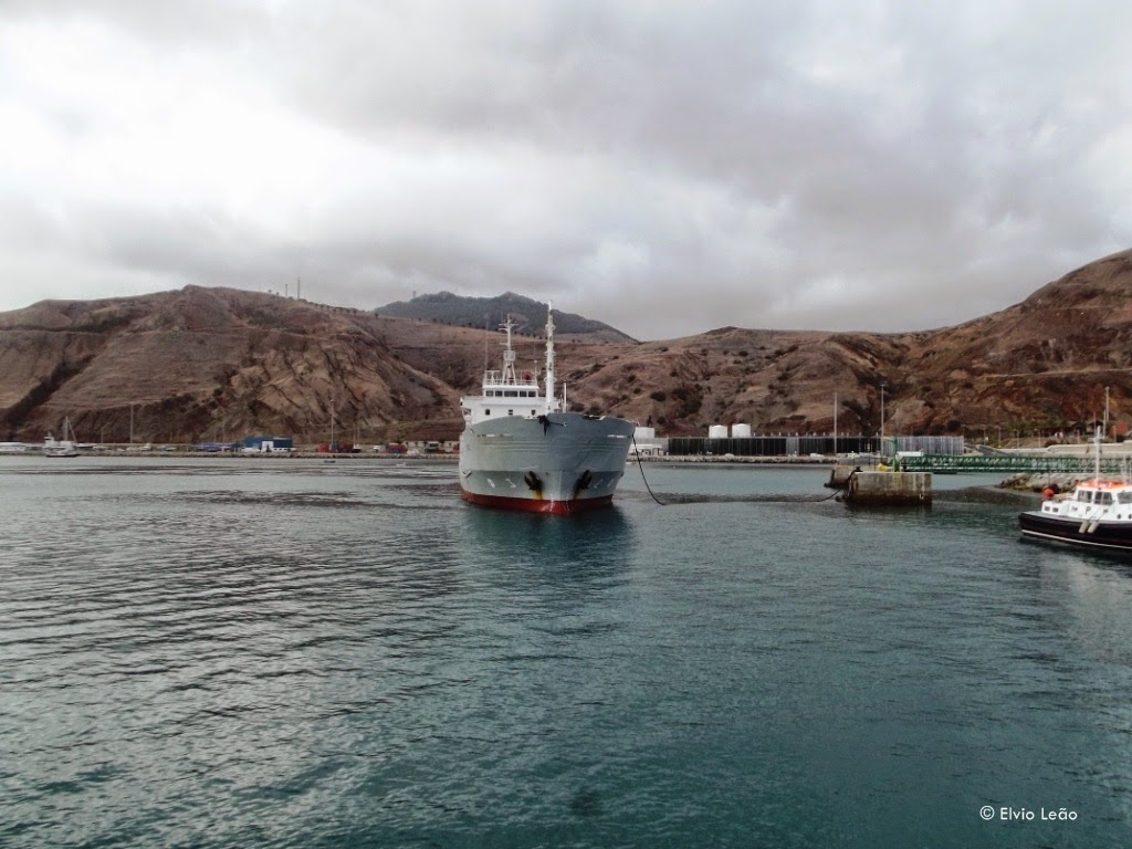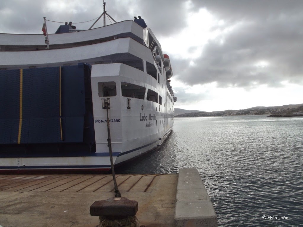 Alguns camiões aguardam hora de embarque no ferry para seguir para o Funchal, depois de terem feito chegar aos seus destinatarios as mercadorias que transportaram na viagem de manha desde o Funchal, o que demonstra bem a importancia das ligaçoes ferry no transporte de , não só passageiros , mas tambem mercadorias.